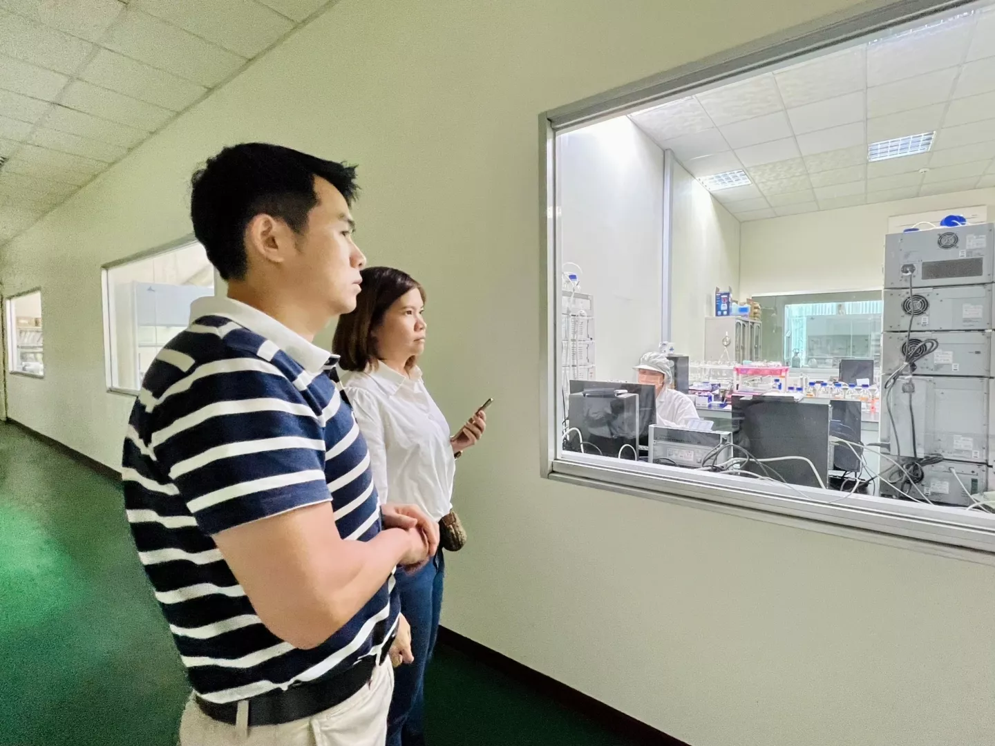接著,與廠長一同至製藥廠實驗室了解檢驗設備、檢驗流程及了解食品安全觀念。