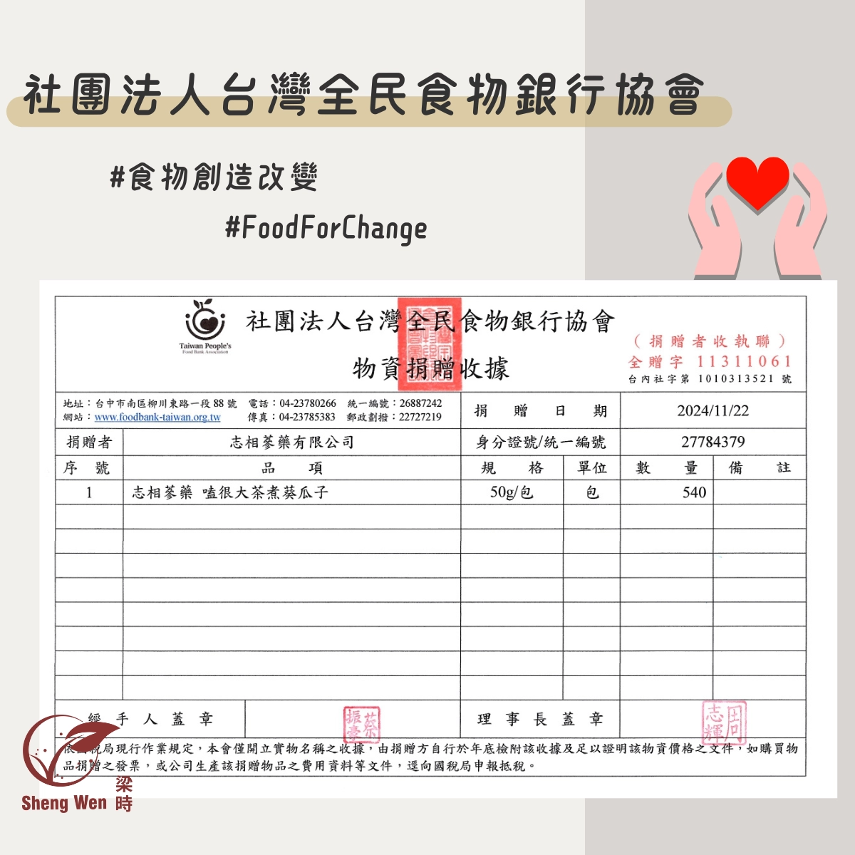 謝謝社團法人台灣全民食物銀行協會協助我們解決原本應被報廢之產品
