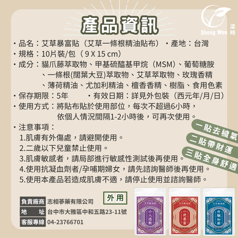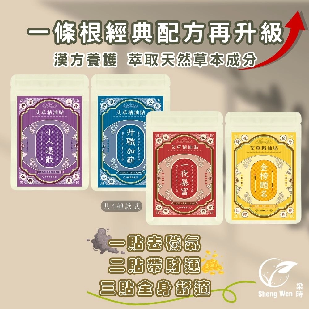 #ShengWen #ShengWen梁時 #艾草暴富貼 #一條根精油貼布 #艾草精油貼 #一條根 #金門一條根 #精油貼布 #台灣製造 #葡萄糖胺貼布 #貼布 #貓爪藤 #MSM #葡萄糖胺 #玫瑰 #薄荷 #尤加利 #檀香