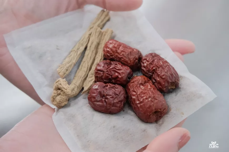 左圖是元氣人參雞湯的燉包,棉包內有:人蔘、黨蔘、當歸、肉桂、黃耆、枸杞、紅棗等食材。(參考商品包裝所述)另外還附了黨蔘跟紅棗耶!