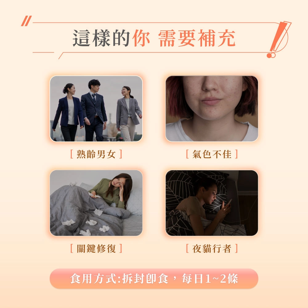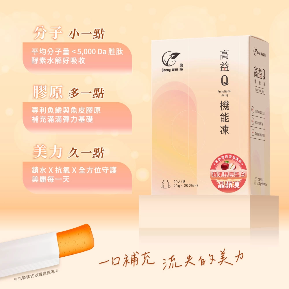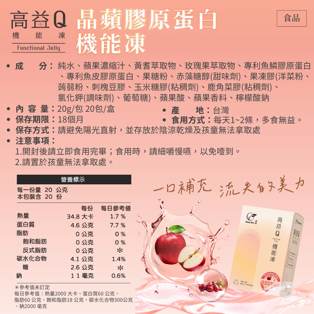 純水、蘋果濃縮汁、黃耆萃取物、玫瑰果萃取物、專利魚鱗膠原蛋白、專利魚皮膠原蛋白、果糖粉、赤藻糖醇(甜味劑)、果凍膠(洋菜粉、蒟蒻粉、刺槐豆膠、玉米糖膠(粘稠劑)、鹿角菜膠(粘稠劑)、氯化鉀(調味劑)、葡萄糖)、蘋果酸、蘋果香料、檸檬酸鈉 |