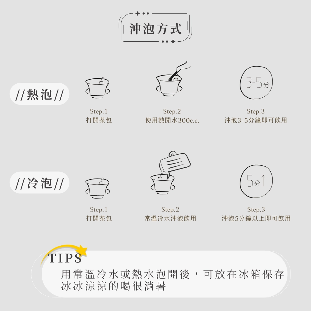 1. 使用熱水250c.c.-300c.c.沖泡3-5分鐘後即可飲用。