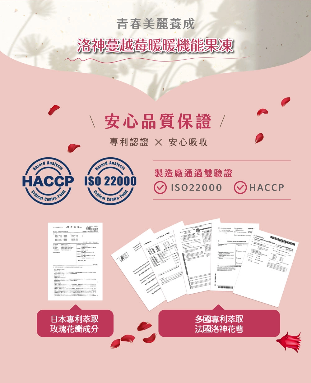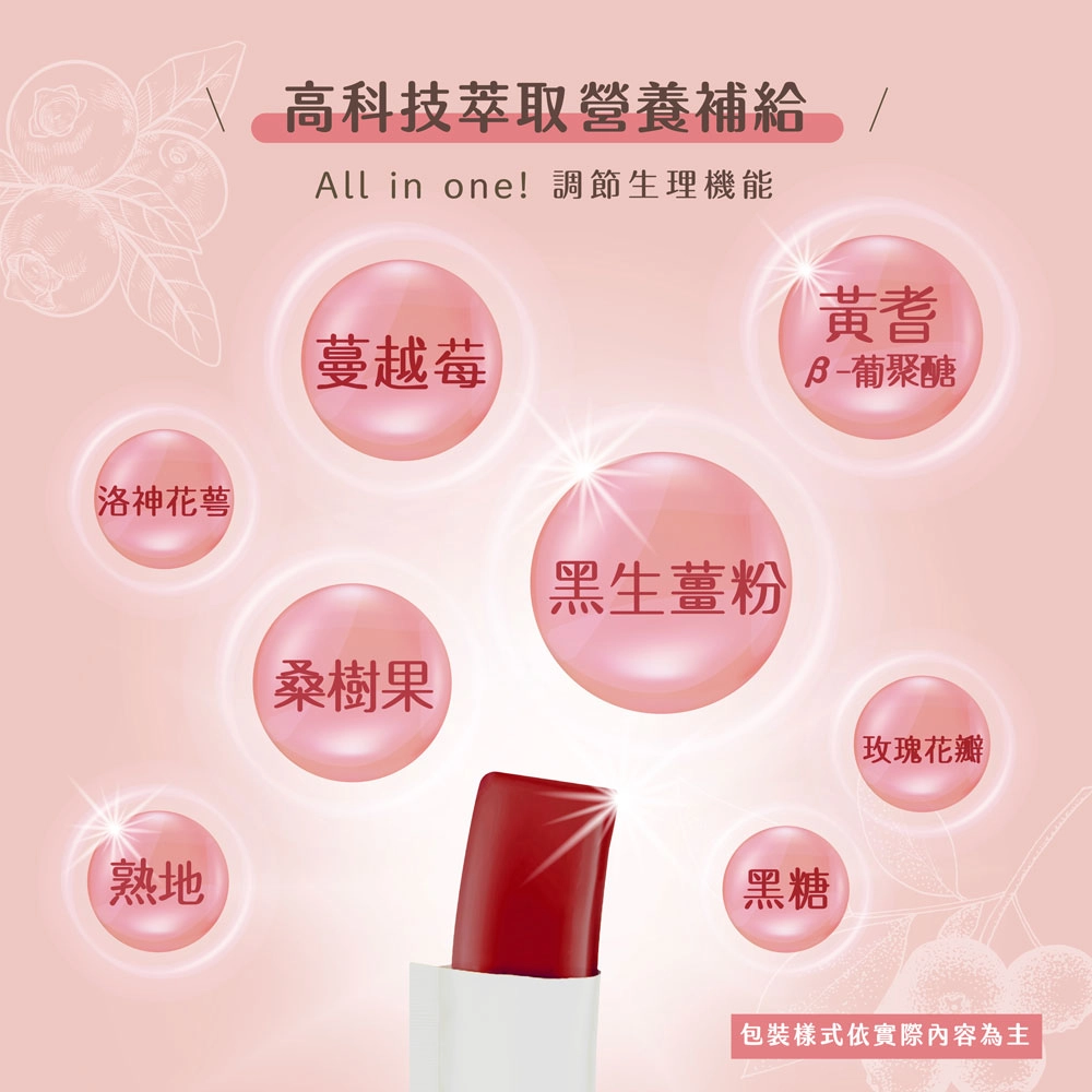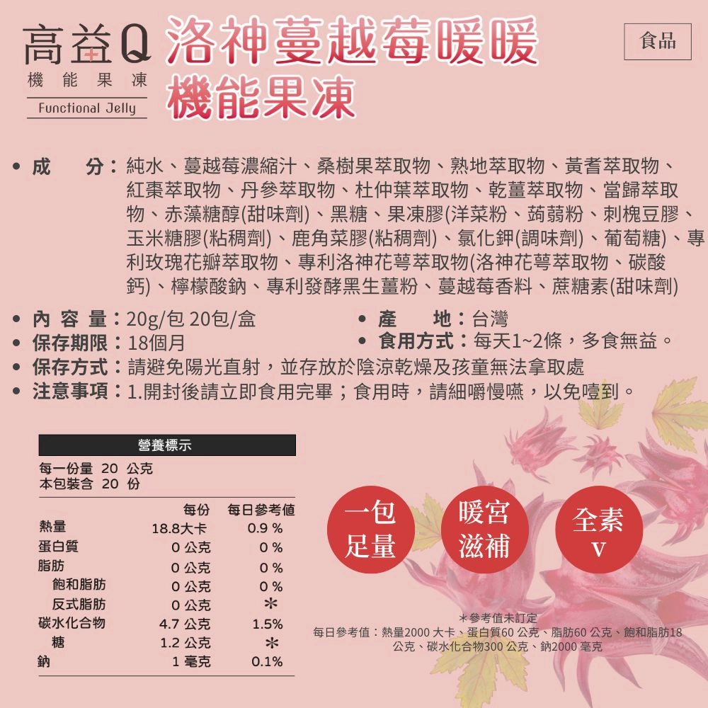 純水、蔓越莓濃縮汁、桑樹果萃取物、熟地萃取物、黃耆萃取物、紅棗萃取物、丹蔘萃取物、杜仲葉萃取物、乾薑萃取物、當歸萃取物、赤藻糖醇(甜味劑)、黑糖、果凍膠(洋菜粉、蒟蒻粉、刺槐豆膠、玉米糖膠(粘稠劑)、鹿角菜膠(粘稠劑)、氯化鉀(調味劑)、葡萄糖)、專利玫瑰花瓣萃取物、專利洛神花萼萃取物(洛神花萼萃取物、碳酸鈣)、檸檬酸鈉、專利發酵黑生薑粉、蔓越莓香料、蔗糖素(甜味劑) |