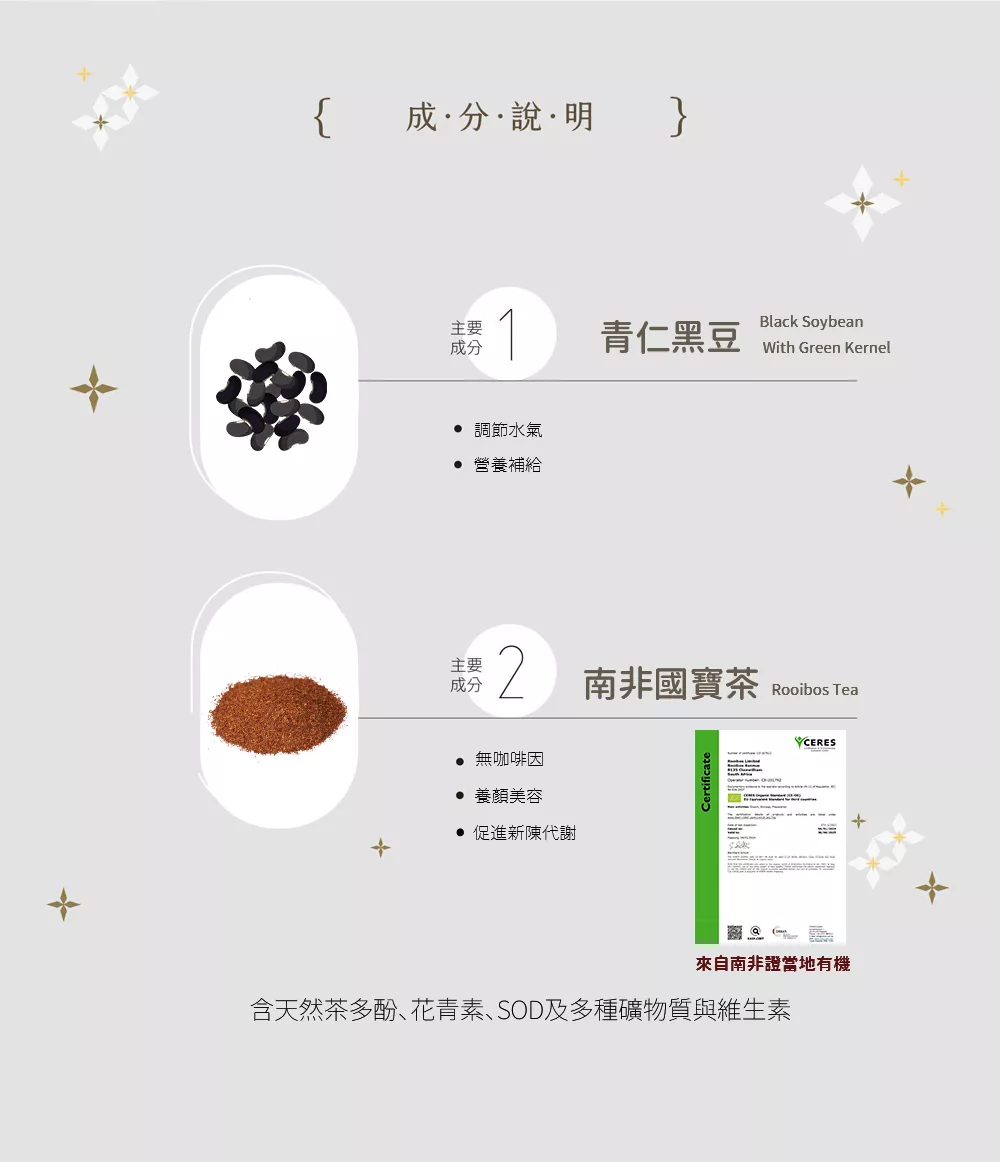 - ◾選用台灣青仁黑豆與南非國寶茶